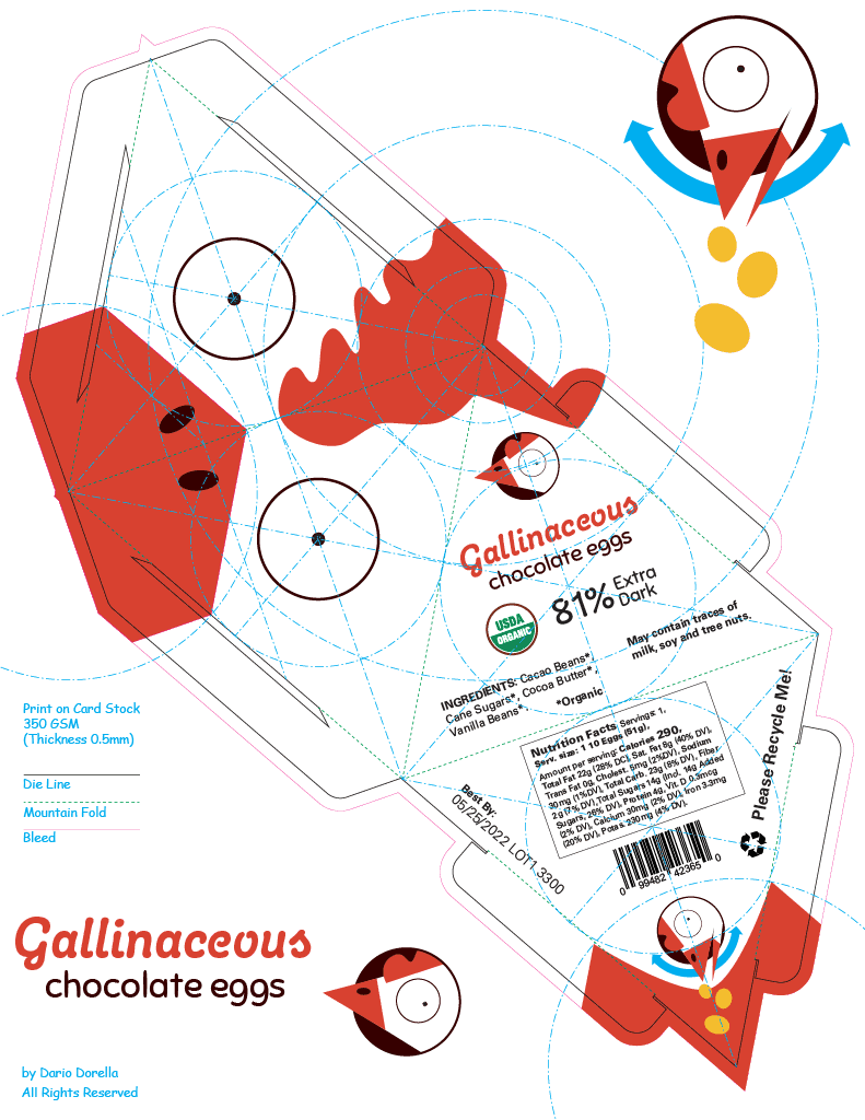 For an extra challenge the package is designed to stick together without glue. The prototypes worked well. Though I have not tried this at scale, the few lucky recipients of a Gallinaceous Chocolate Eggs package did not report it falling apart.