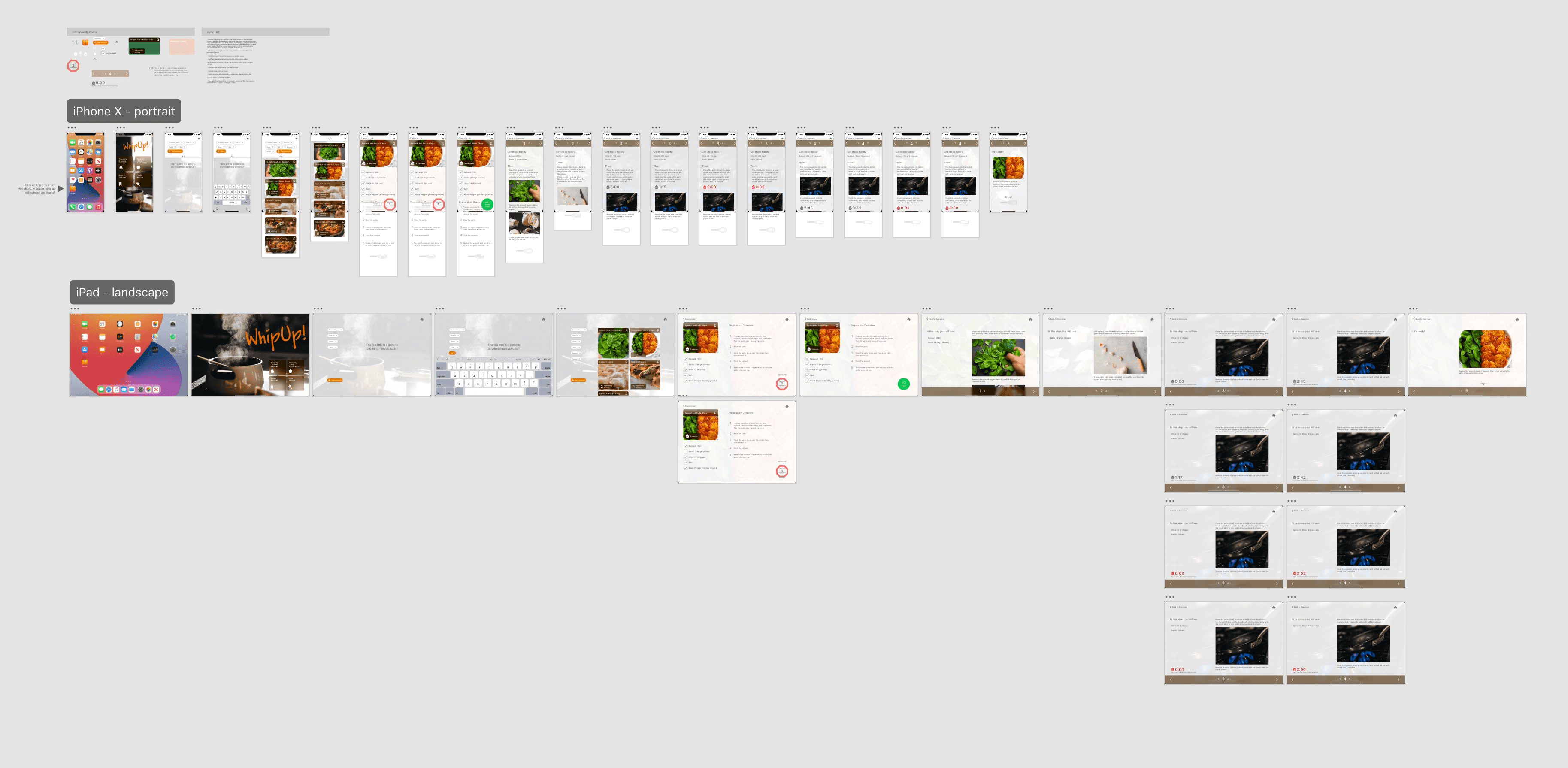 whipUp! will help preparing the recipe by following the user with a step by step guide: once the recipe is selected and ingredient list and tools availability have been double checked, the "Let's whip this up!" button will trigger a step-by-step real-time interactive guide to help cook the dish (eg. assist with kitchen timers) featuring an interface with large text, text-to-speech capability and controls that can be operated when the fingertips are dirty, for example using voice activation, gestures (eg. waive hands in fpront of the device frontal camera) and buttons that can be triggered using elbows or the back of the hand (so that the iPhone, iPad doesn't get oily or otherwise dirty).