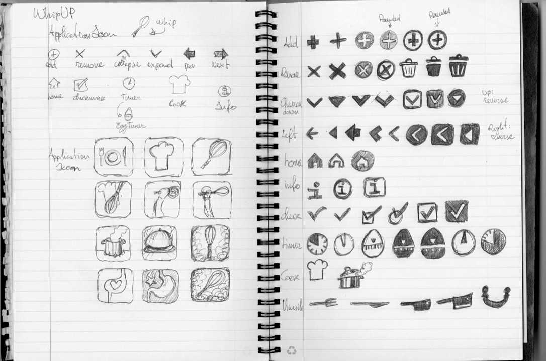 With the main type being a San Serif, the wordmark had to be more playful: Jakob's (from Adobe Fonts) handwritten yet clean and controlled feel complements San Francisco nicely. The exclamation mark was added for some extra spiciness and because is very similar to the logo used in the application icon: a stylized kitchen whip. The name whipUp! is of course because of its meaning: cook something quickly.